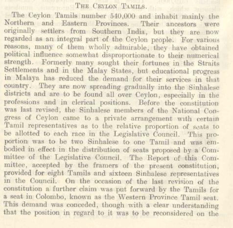C01041/8-Donomough Constitutional Reforms(This British Goverment report, states on the Ceylon Tamil, as follows....Link....p92.) Please notice, that its clearly stated that the Tamil that went from South India after been unable to find work in Malaya and such places, are now moving into Sinhala areas of Ceylon for work.