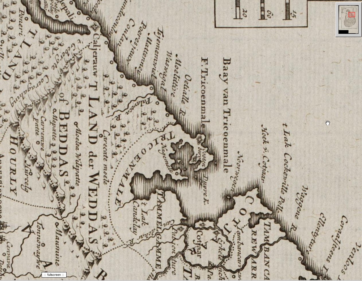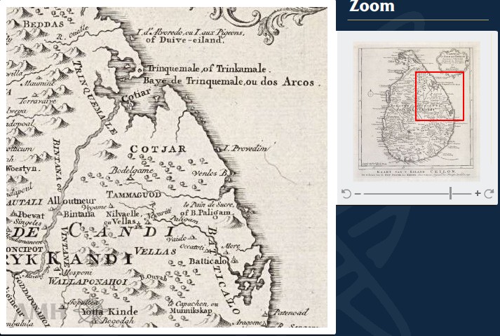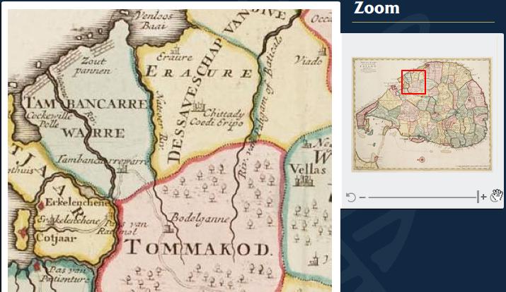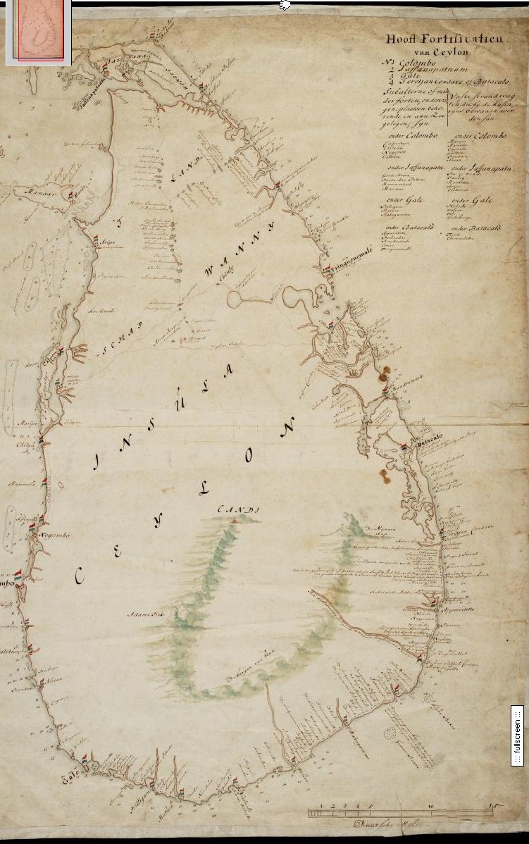B. Van Leir map, 1751. This map is kept in the Hague in Brussels. What makes this Dutch map, so important, is that it contains all the names of the districts of then Sinhale. For example, Panangama, which today consisting of parts of Mannar, Vavuniya and Mullativu districts. Anurajapura, has been made smaller, as initially, it consisted of parts of Mannar and was all the way to the coast and also what is today north Triquenamale district. Many of the districts bore their original Sinhala names but now in many cases, they bare Tamilized names eg Waligama-Valikamaman. Also notice, in the Eastern parts of the country in 1751. Their was still a district called Maha Rohana. |
